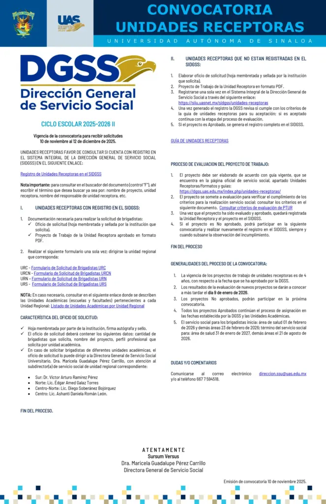 La Dirección General de Servicio Social (DGSS) de la Universidad Autónoma de Sinaloa invita a todas las Unidades Receptoras a participar en la Convocatoria del Ciclo Escolar 2025–2026 II, vigente del 10 de noviembre al 12 de diciembre de 2025.