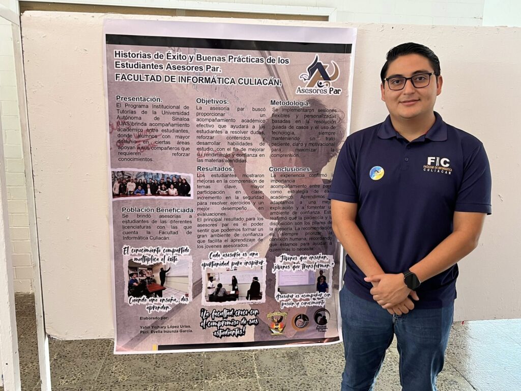 Asimismo, durante la exposición de carteles, contamos con la valiosa participación y presentación del alumno de quinto año: Yahir Yojhary López Urias, consejero universitario de la Facultad de Informática y actual asesor par, quien representó con orgullo y profesionalismo a nuestra comunidad.